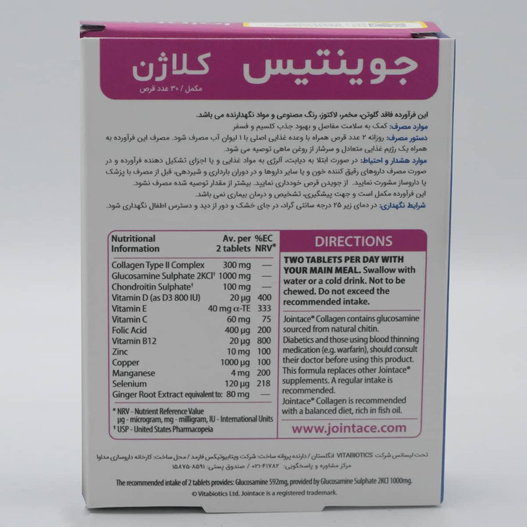 🌟 قرص جوینتیس کلاژن ویتابیوتیکس حاوی کلاژن خوراکی، گلوکزامین، کندروئیتین و ویتامین های C، E، D3، B12 ، مواد معدنی و زنجبیل است. قرص جوینتیس کلاژن ویتا بیوتیکس علاوه بر اینکه در تامین سلامت و محافظت از مفاصل بسیار مفید است، به دلیل فرمولاسیون منحصر به فرد، درد را کاهش داده و ناراحتی در این نواحی را از بین می برد.