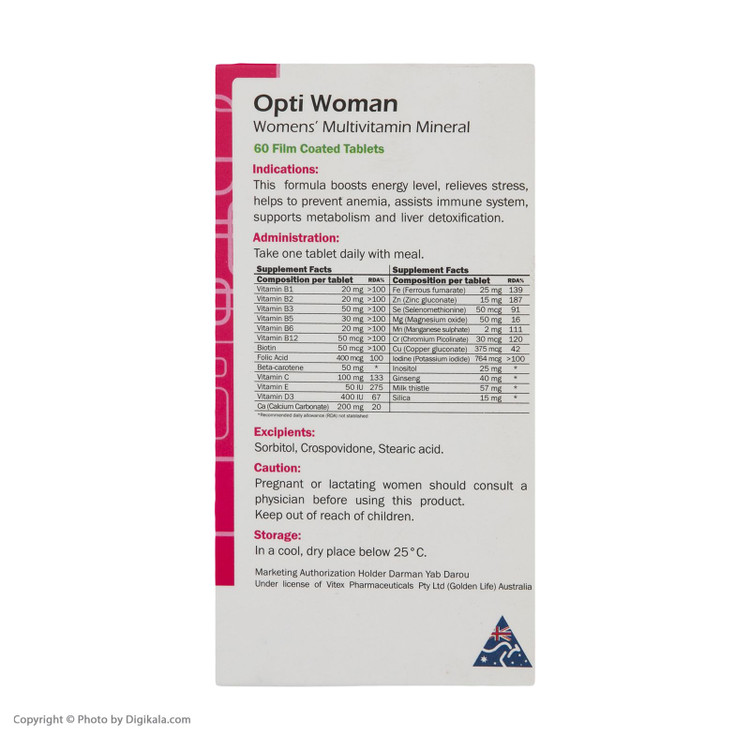 🌟مولتی ویتامین و مینرال اپتی وومن مخصوص بانوان حاوی ترکیباتی نظیر ویتامینهای گروه B، آنتیاکسیدانها، آهن و مواد معدنی مانند زینک و مس است که میتوانند اثرات مطلوبی بر سلامت پوست، مو و ناخن، تقویت سیستم ایمنی، بهبود متابولیسم انرژی، جلوگیری از کمخونی و حفظ سلامت عمومی بدن داشته باشند.